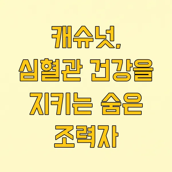 "오늘은 저와 함께 캐슈넛의 다채로운 효능, 특히 심혈관 건강 에 미치는 긍정적인 영향에 대해 꼼꼼하게 알아보는 시간을 가져볼게요. 맛있는 캐슈넛 한 줌으로 건강을 챙길 수 있는 비결, 지금부터 공개합니다!"
